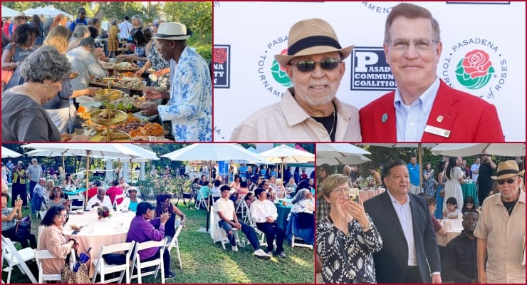 About 500 community members attended Sunday’s open house at the Wrigley Mansion. Pictured: Martin Gordon of the Pasadena Community Coalition with Tournament President Mark Leavens, and Mayor Victor Gordo with Gordon. [Photos courtesy of the Tournament of Roses and Eddie Rivera/Pasadena Now]